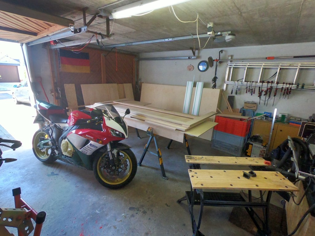 Mit diesem Plan ging es dann in die Werkstatt. Naja, vielleicht ist Werkstatt ein etwas zu hoch gestochener Begriff. Die eine Hälfte unserer Doppelgarage wurde mehr oder weniger leer geräumt und die benötigten Maschinen dort aufgestellt.
