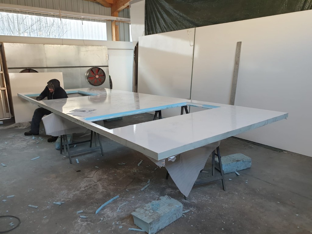 Für den Boden wird eine Kombination aus 2mm GFK, 6.5mm Birke- Multiplex, 76.5mm HD 300 Schaum, 6.6mm Birke-Multiplex, 6.5mm Birke-Multiplex und nochmals 2mm GFK verwendet. Somit ist der Boden sage und schreibe 100mm, also 10cm dick.
