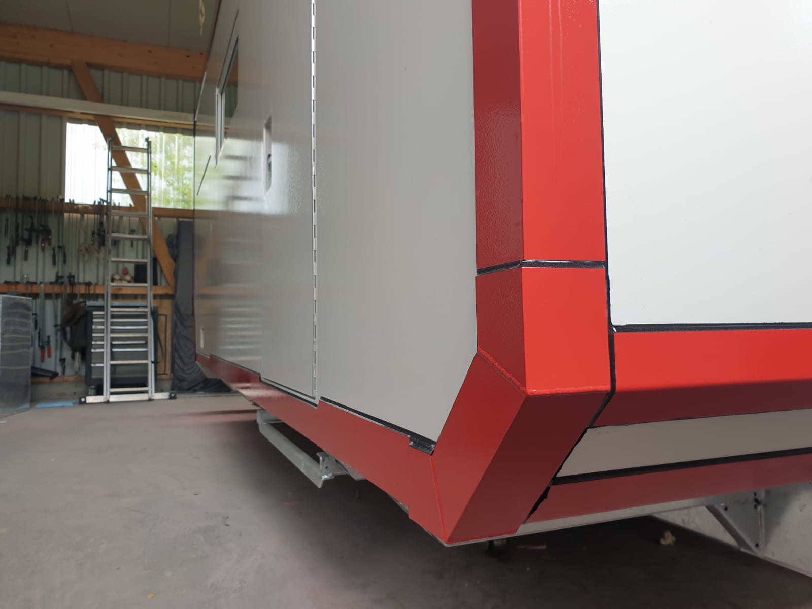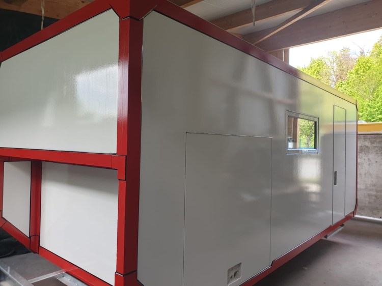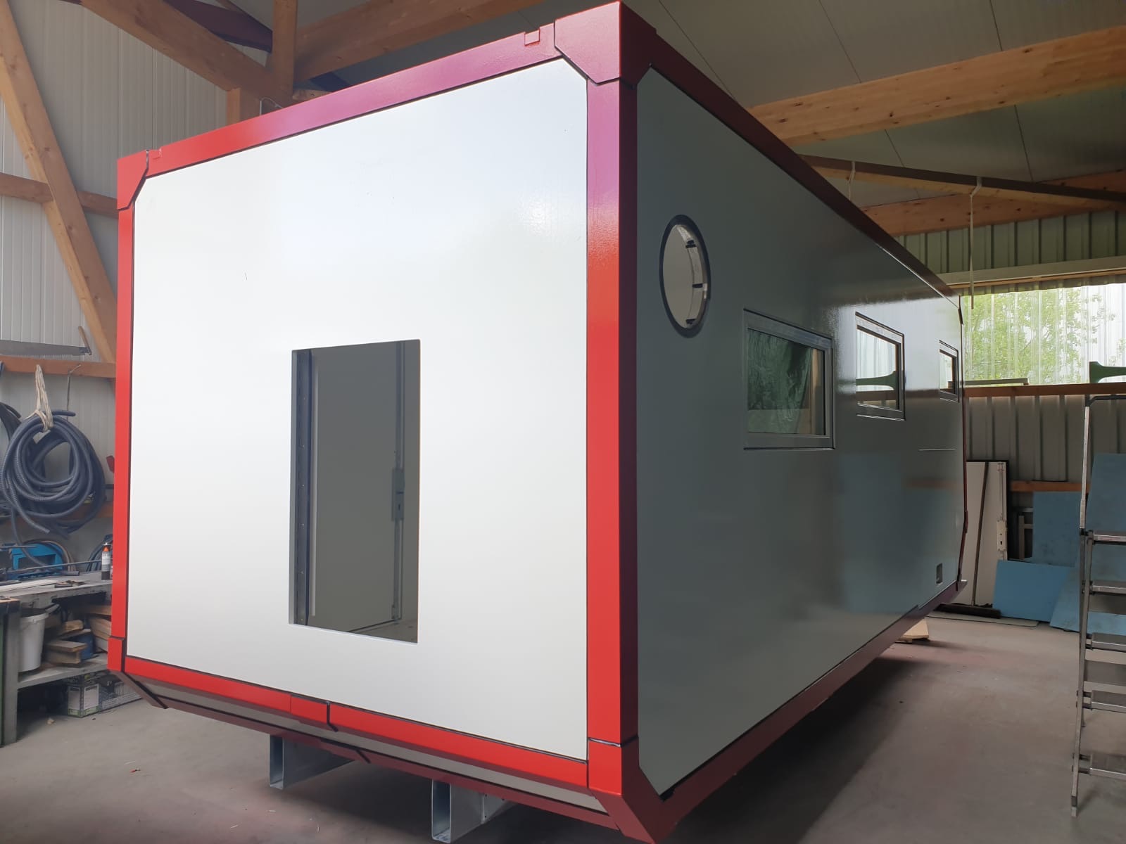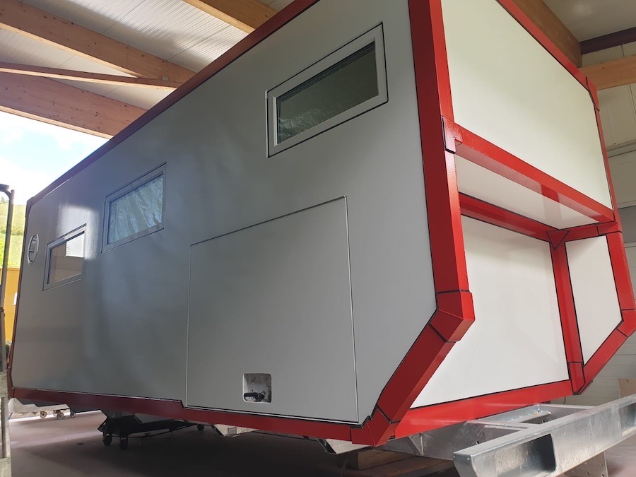 Gerade gestern erreichten uns neue Bilder. Die Kabine ist nun fertig lackiert und die Übergänge an den Fenstern und den großen Alu-Winkeln sind verfugt.