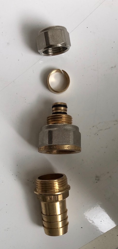 Und spätestens hier wird der Titel dieses Blogs deutlich. Es gibt so viele Schraubverbindungen mit unterschiedlichen Durchmessern. Diverse Zollmaße, diverse mm-Maße und alle wollen irgendwie mit einander verbunden werden. 1 Zoll und ¾ Zoll am Heizungsverteiler, 16mm Verbundrohre, 22mm Innendurchmesser der Gummischläuche. Und dann kommt da noch die Frage ob später alles dicht sein wird.