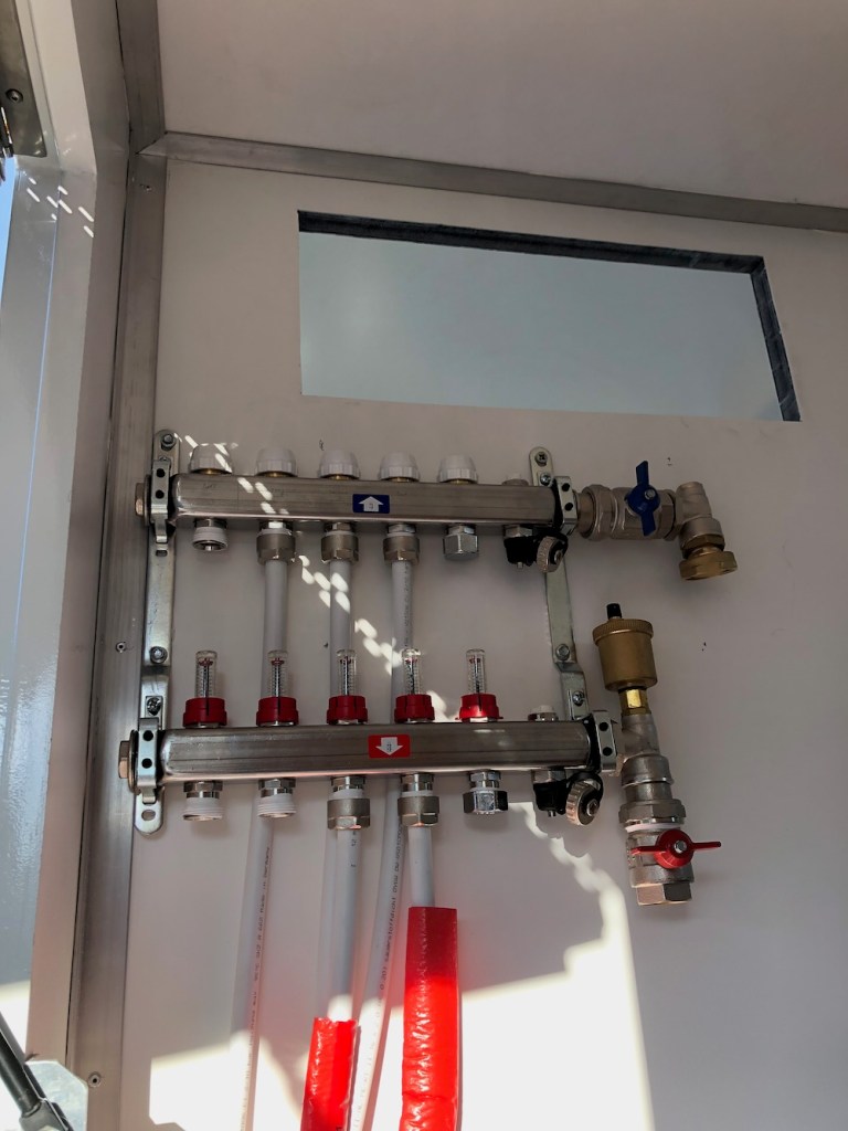 Es ist also eine professionelle Verteilung aus dem Bereich der Fussbodenheizungen geworden. Hier kann man am Rücklauf die Durchflussmenge einstellen und durch kleine Schaugläser im Vorlauf das Ergebnis beobachten.