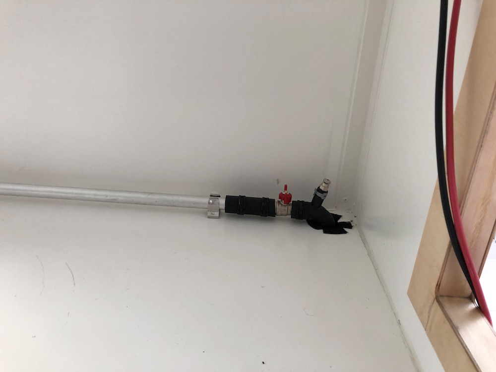 Die Leitung hierfür kommt aus dem Boden des Bettes. An dieser Stelle findet sich eine Entlüftung und ein Kugelhahn. Mit ihm können wir die Heizung hier oben regulieren. Die Temperatur vom Rest des Wohnraums regeln wir über einen zentralen Thermostaten. Das Bad wird ebenfalls separat regelbar werden.