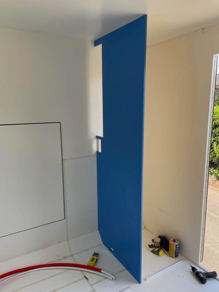 In den folgenden Tagen ging es Schlag auf Schlag weiter. Die einzelnen Wandteile, die das Bad bilden, wurden nach und nach eingebaut.
