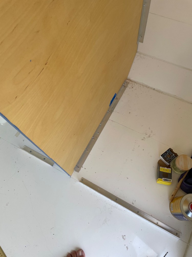 Beim Einpassen der Platte für den Waschtisch zeigte sich, dass wir alle wirklich bis auf den Millimeter genau gearbeitet hatten. Nur an der Ecke, an der das Scharnier für die Durchgangstür zum Fahrerhaus sitzt, musste der Waschtisch etwas ausgeschnitten werden.