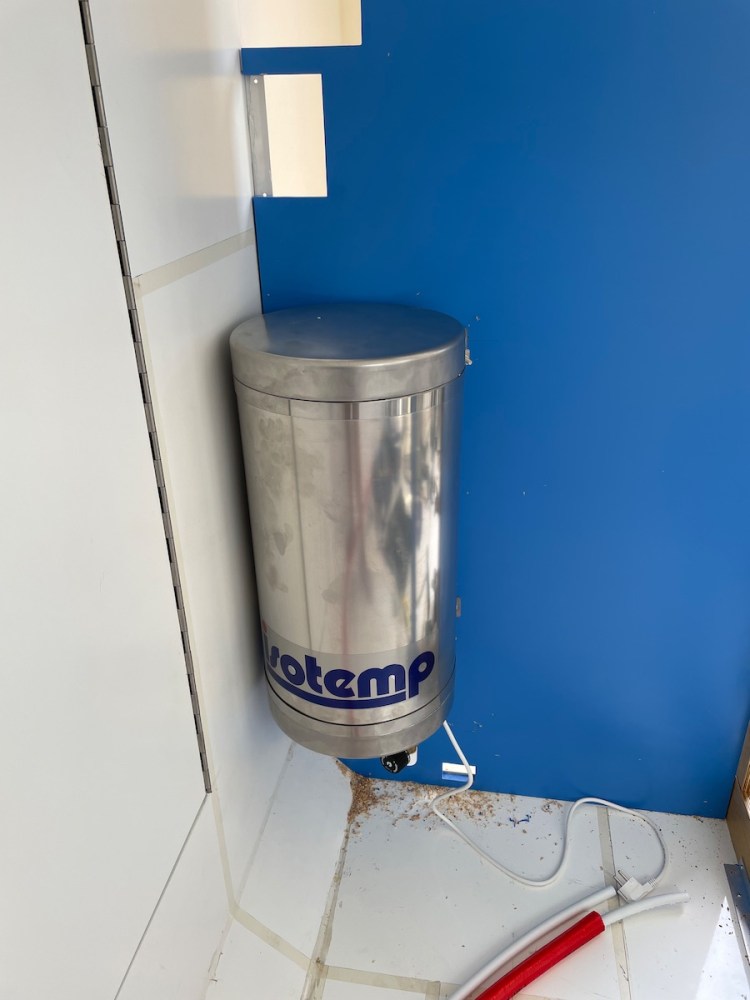 An diese Wand wurde der Warmwasserboiler montiert. Jetzt war noch genügend Platz um das ohne großes Gefummel in irgendwelchen Ecken und Nieschen zu erledigen. Da der Boiler an sich schon ein echter Klotz ist (hoffentlich haben wir uns mit der Größe nicht übernommen) und mit Wasser gefüllt noch einmal 20Kg schwerer wird, muß die Befestigung schon einiges aushalten. Wir haben uns dazu entschieden, Einschlagmuttern in die Wand einzubringen und den Boiler daran zu verschrauben. Wir denken, das sollte stabil genug sein.