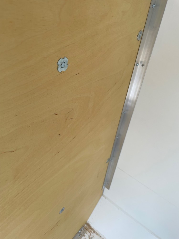 Im Boden befindet sich unter der Deckschicht aus GFK eine 15mm starke Holzschicht. Hier reicht es, die Leisten und Winkel einfach mit Schrauben am Boden zu verschrauben. Die Wände haben jedoch keine solche Holzschicht. Hier werden die Leisten mit (Achtung, Schleichwerbung) Sikaflex verklebt. Damit die Leisten während der Trocknungszeit nicht verrutschen werden sie mit Nieten in Position gehalten.