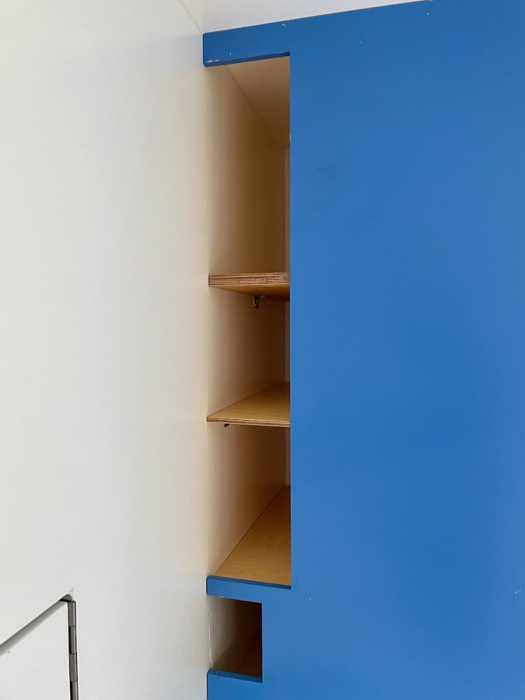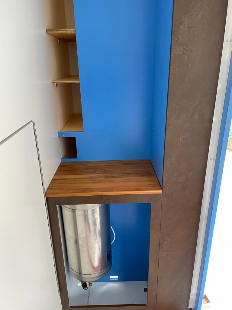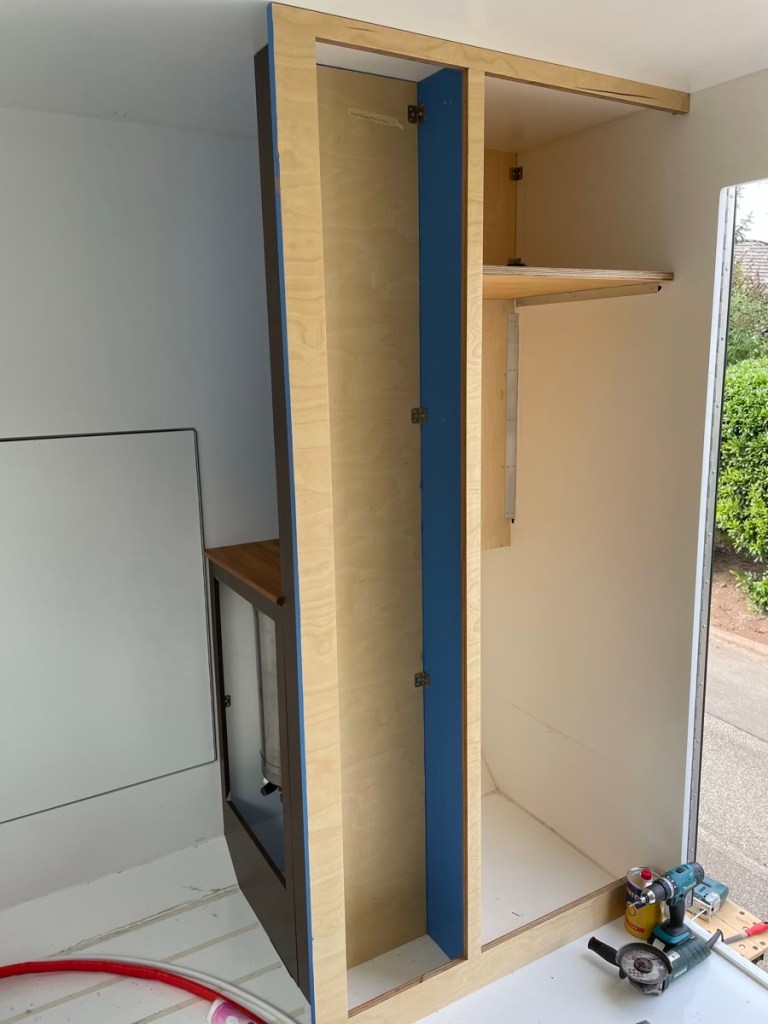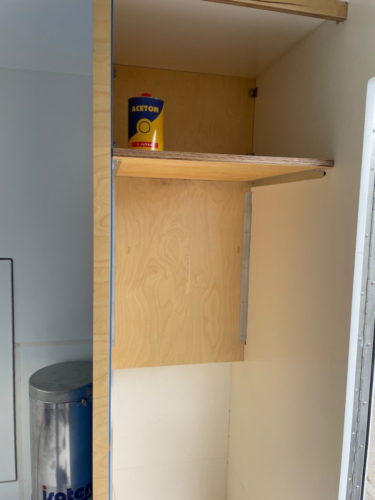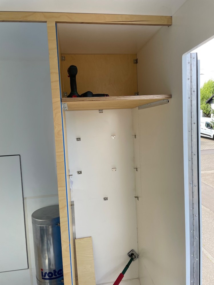 Der weitere Aufbau des Schranks glich dem Spiel Tetris. Wir mussten genau überlegen, welches Brett wir als nächstes einbauten. Der Schrank ist alles in allem etwas verschachtelt. In dem Bereich, den man vom Wohnraum aus sieht, werden später der Kühlschrank und der Backofen stehen. Darüber werden diverse größere Küchengeräte ihre Garage haben. Hinter all diesem wäre allerdings ziemlich viel Freiraum. Dieser Freiraum wird vom Bad aus durch kleine Fächer genutzt.