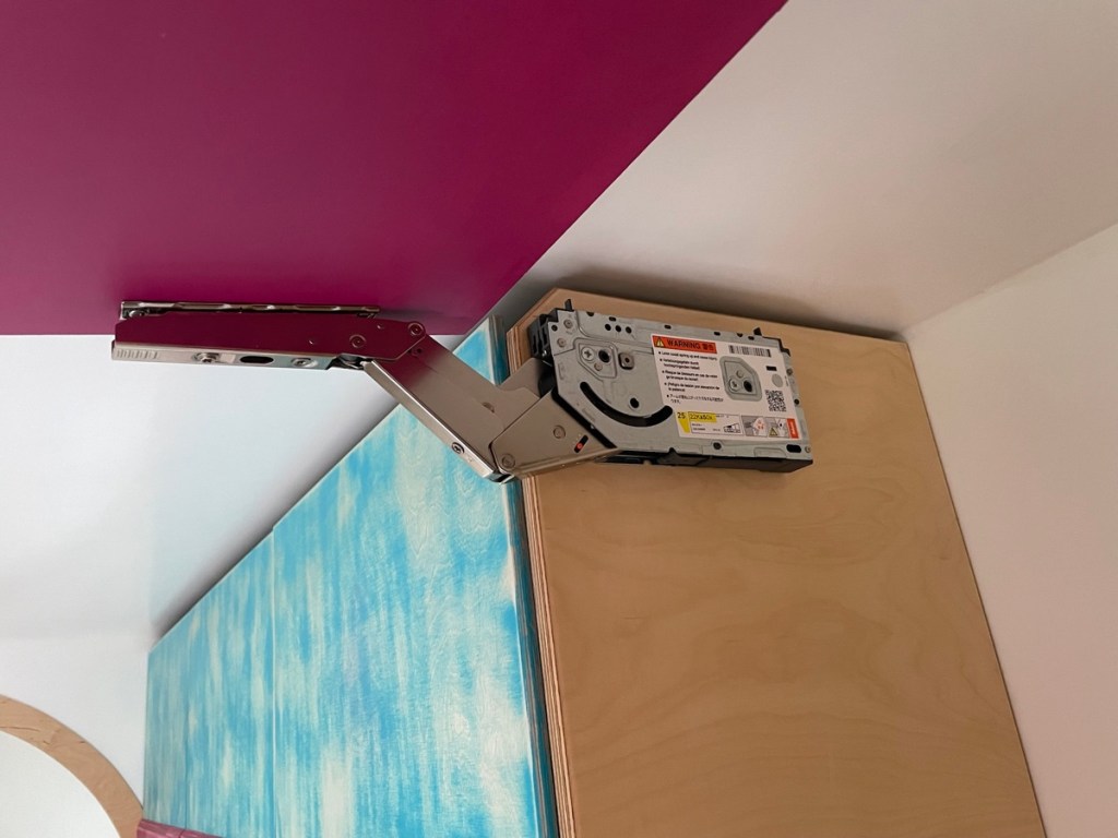 Die Hängeschränke bekommen nun auch ihre Scharniere. Es wäre keine richtige Männersache, wenn diese natürlich nicht überdimensioniert und total übertrieben wären. Bei der Firma Blum hat sich Rico für das Modell der Oberklasse entschieden, das unzählige Einstellungsmöglichkeiten bietet, wie z. B. Öffnungswinkel, Gewicht der Front und Positionierung der Front.