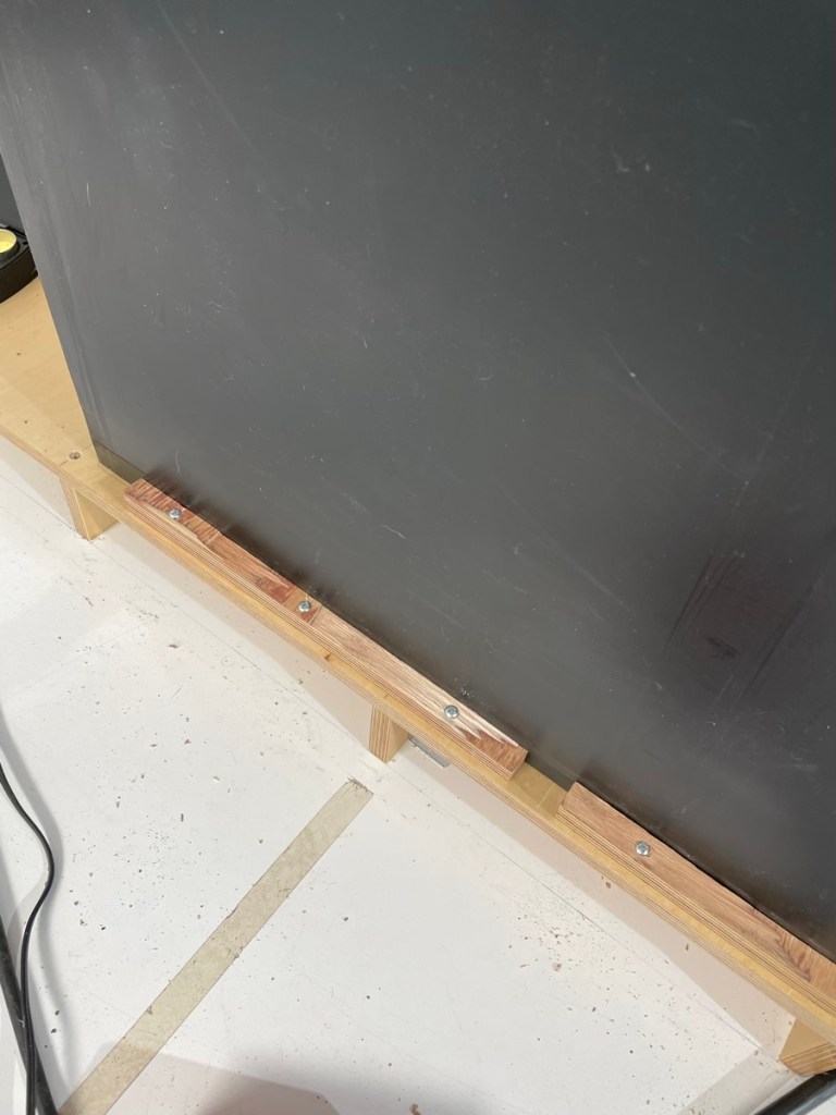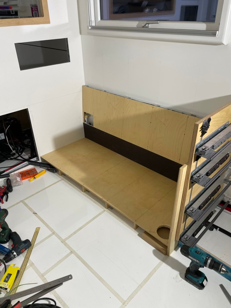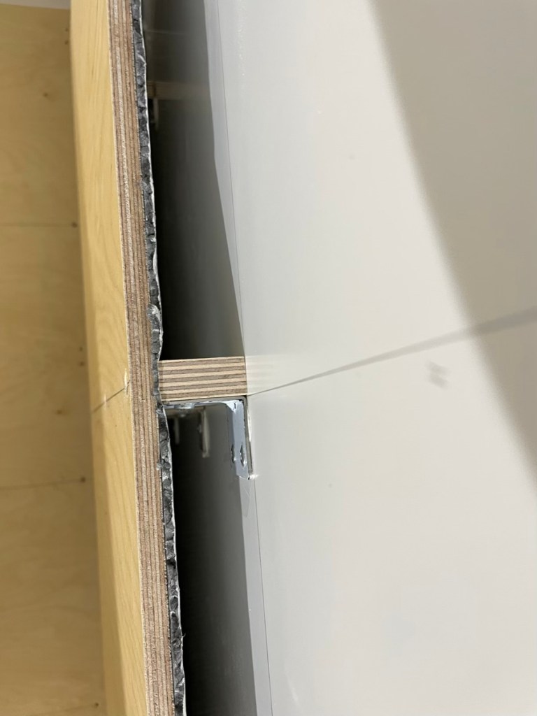 Dann ging es mit der Rückwand der Sitzbank weiter. Hierzu haben wir Abstandshalter an die Wand geklebt, auf die die beiden Teile der Rückwand geschraubt wurden. Im unteren Teil der Rückwand verjüngt sich der Abstand zwischen der Wand des Aufbaus und der Rückwand der Sitzbank. Der obere Teil verläuft parallel zur Rückwand.