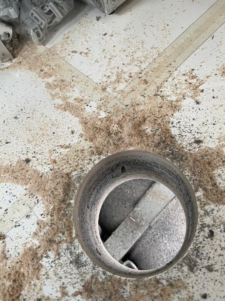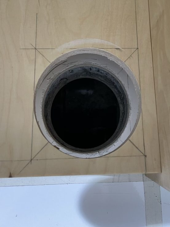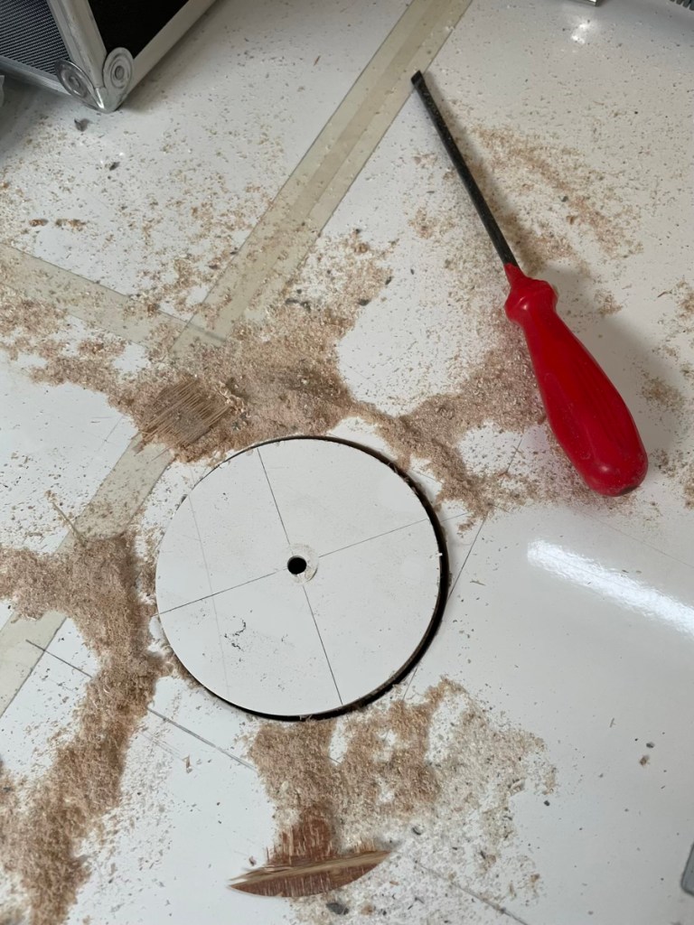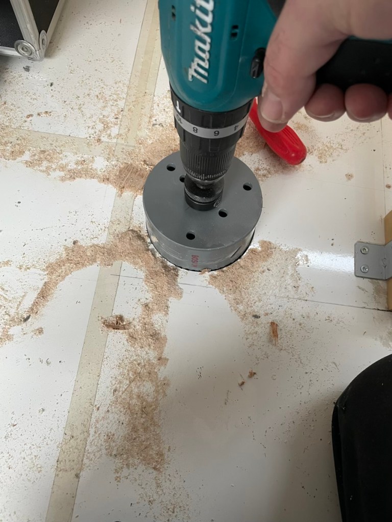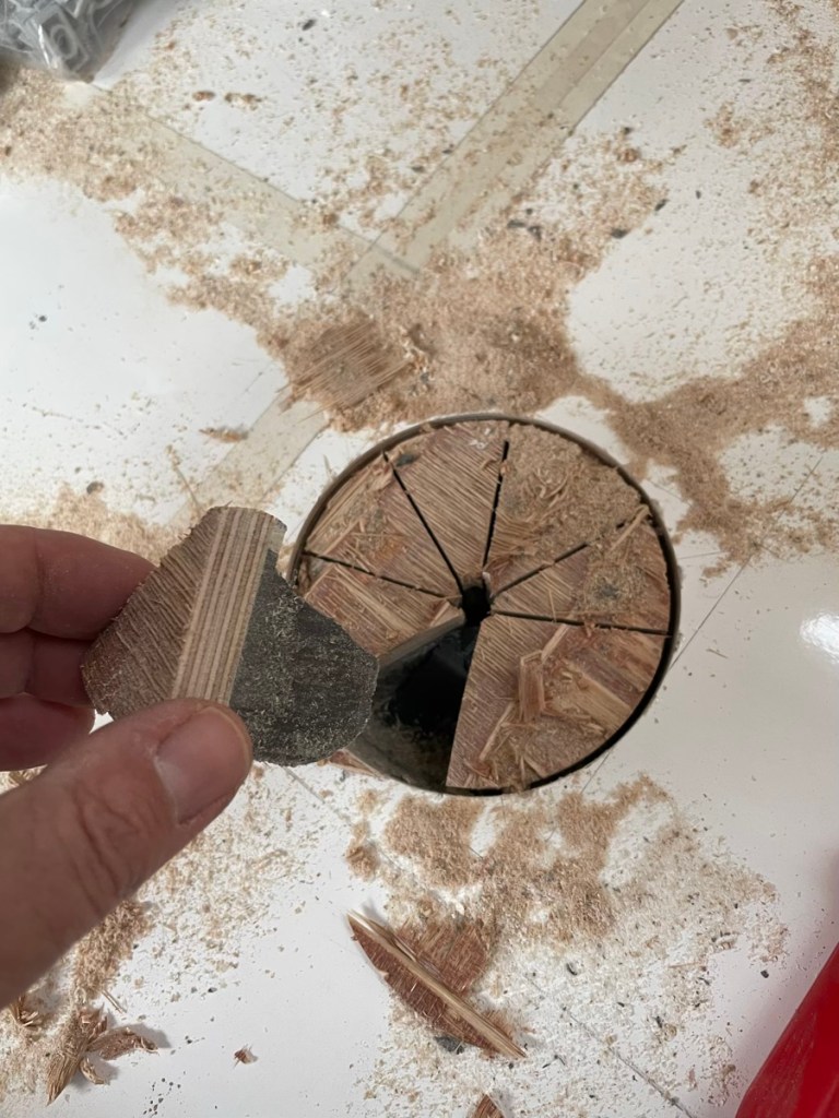 Es ist ein Spaß, solch große Löcher in einen 10cm dicken Boden, bestehend aus GFK, Holz und PET zu schneiden. In den folgenden Bildern zeigen wir Euch mal, wie wir das gemacht haben: