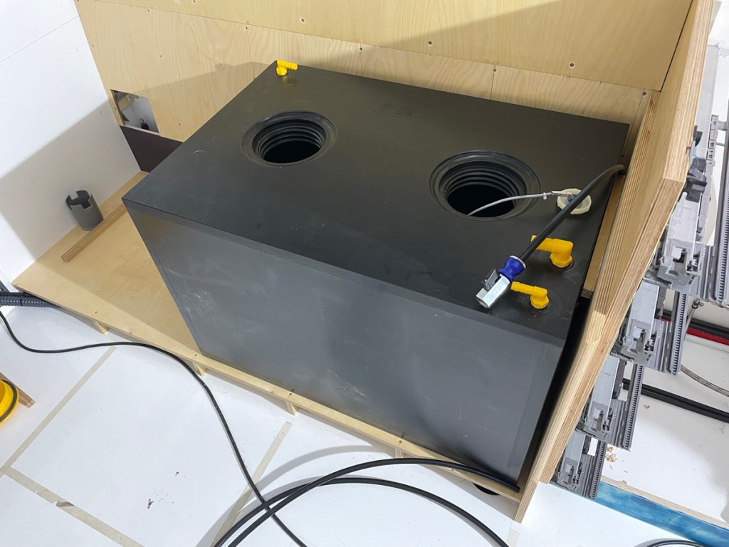 Auf dem Bild oben sieht man ein großes Loch. Dieses Loch ist für die Entleerung unserer Wassertanks. Die Tanks sind unten mit einem Rohr ausgestattet, das mit einer Schraubkappe verschlossen ist. Von außen kann man diese Kappe entfernen und so die Tanks komplett leeren. In dem Rohr endet aber auch die Saugleitung, durch die das Wasser entnommen wird. So können wir fast bis auf den letzten Tropfen das Wasser benutzen.