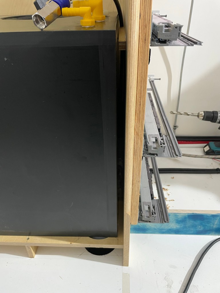 Um noch an die Entlüftung der Heizung zu kommen, hat die Rückwand einen Ausschnitt. Da kommt noch eine Klappe davor.