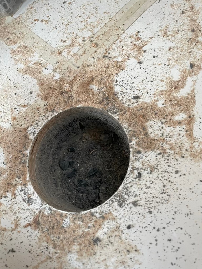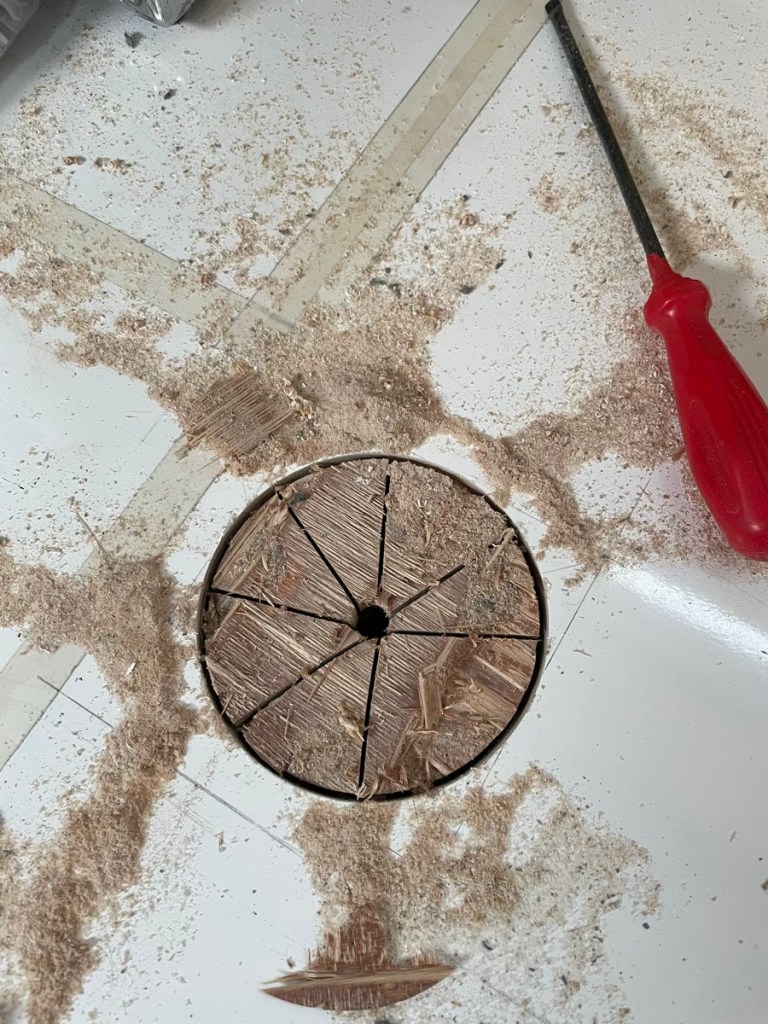 Im ersten Schritt haben wir mit einer Lochsäge mit 110mm Durchmesser so tief gesägt, wir die Tiefe der Säge es zuließ. Dann haben wir mit einem Schraubendreher die GFK-Schicht heraus gebrochen . Mit einer Stichsäge wurde der Kreis dann in handliche Teile geschnitten. Diese ließen sich dann mit ein wenig Hebeln recht leicht heraus nehmen. Im letzten Schritt kam dann wieder die Lochsäge zum Einsatz um bis nach außen durch zu bohren.