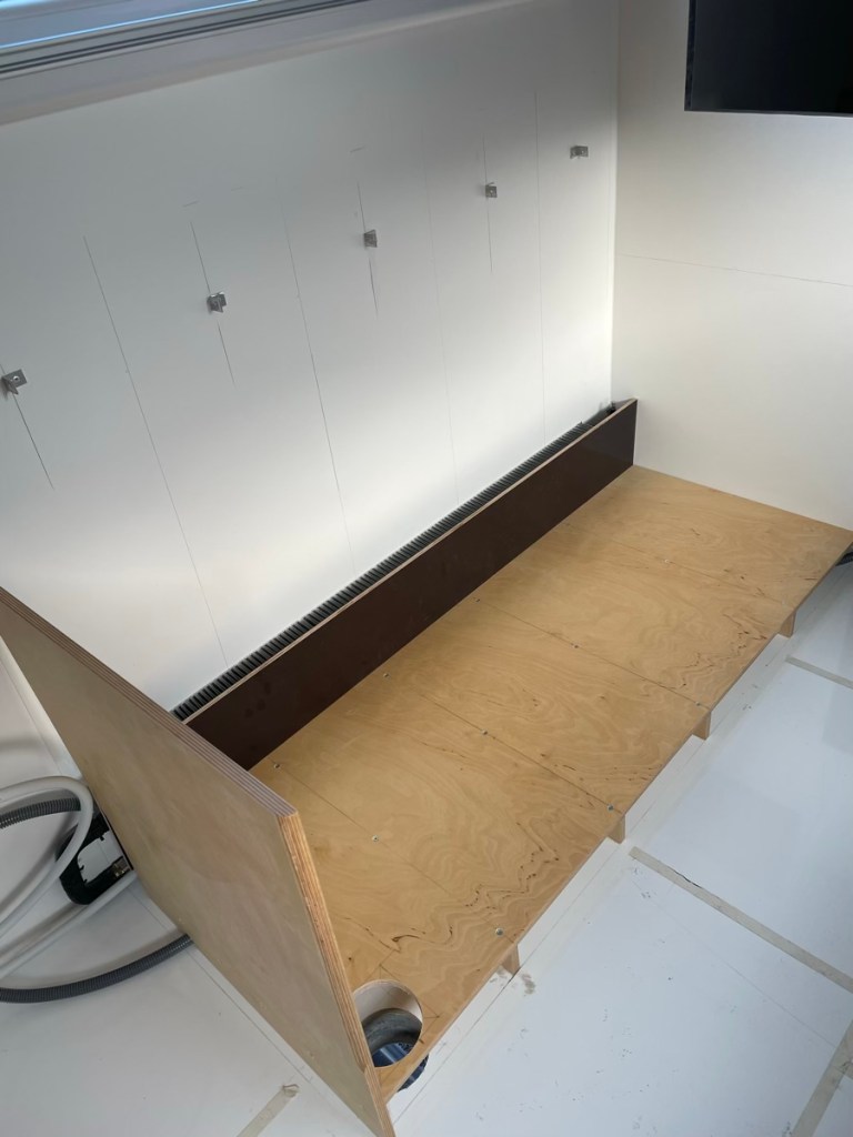 Den Unterbau mit den darunter laufenden Leitungen konnte man im letzten Beitrag schon sehen. Auf diesen Unterbau haben wir den Boden montiert und die Heizung verkleidet.