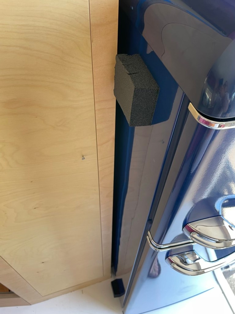 Schnell mal insgesamt 8 Stücke zurecht geschnitten, an die Seiten des Kühlschranks geklebt und ihn in die Nische geschoben, fertig.