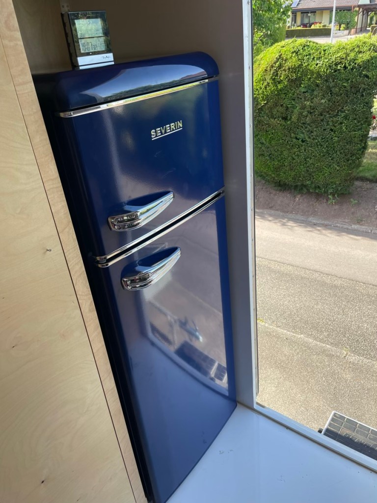 Es wurde ein 230V Kühlschrank von Severin mit einem separaten Gefrierfach. Wir erwarten, dass er die meiste Zeit ein wenig zu groß sein wird. Damit er dennoch einen guten Wirkungsgrad und wenig Stromverbrauch haben wird, werden wir den freien Raum entweder mit Styropor oder mit Getränkeflaschen auffüllen.